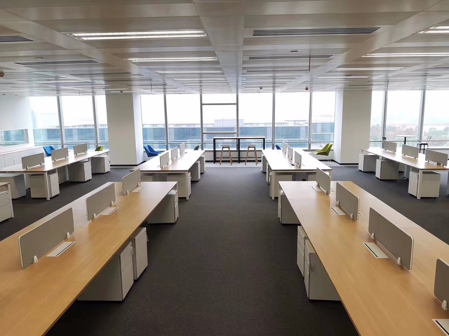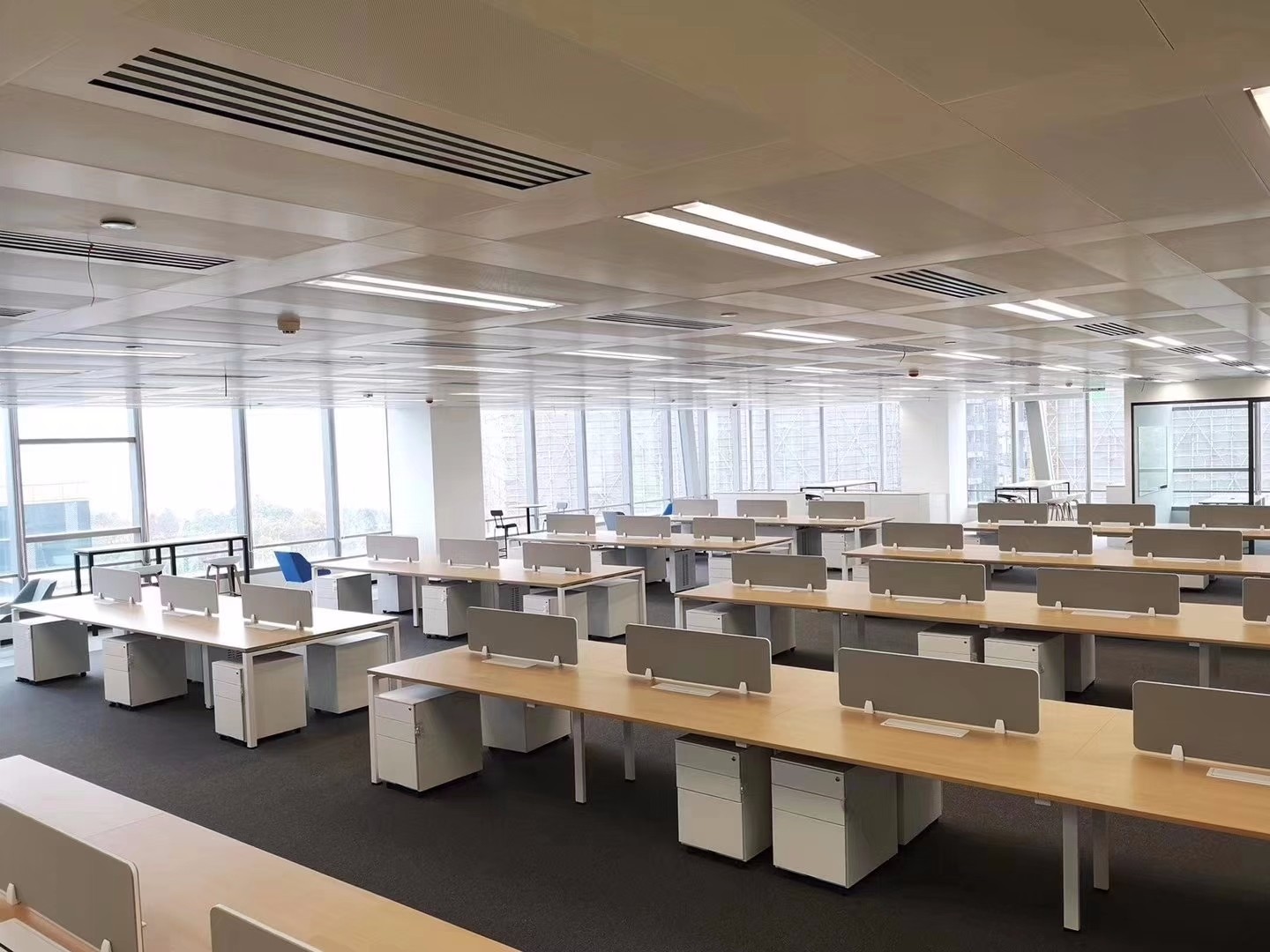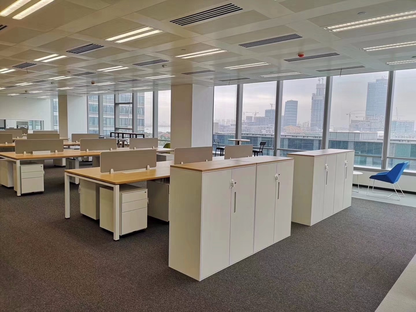 交付标准包括150MM架空地板、矿棉板吊顶、白墙、LED照明系统、单元玻璃门及装饰。