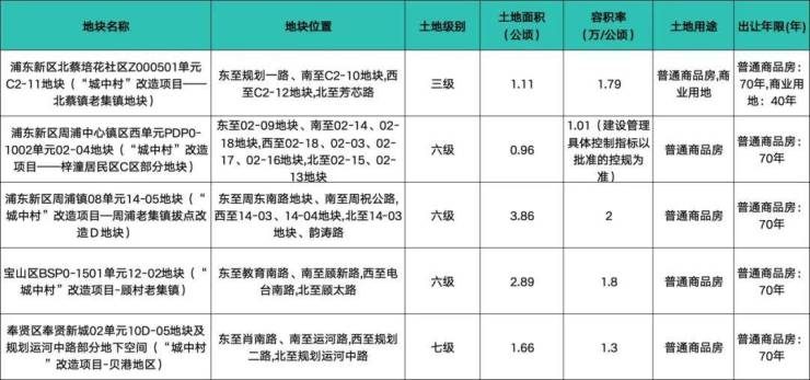 日前,上海市规划和自然资源局发布5宗“城中村”改造地块协议出让公示,其中浦东3宗,宝山和奉贤各1宗,总用地面积约10.48公顷,总建筑面积约18万㎡,公示截止时间为2025年12月24日。