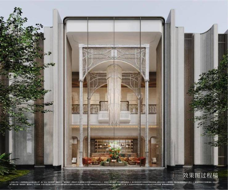 项目深度萃取巴黎白马庄园核心美学,融合上海花园饭店、和平饭店等海派建筑元素。复刻白马庄园标志性阵列柱廊、穹顶、花格窗,入户动线仪式感拉满。立面甄选古铜不锈钢、超白玻璃、天然奢石,以米白贝金石、古铜金属、法式蓝灰玻璃构成低饱和度高级色系,质感通透且历久弥新。