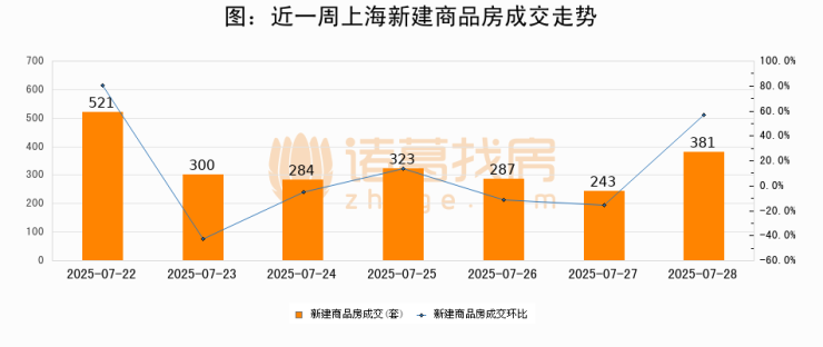 根据上海市房地产交易中心数据显示,2025年07月28日上海新建商品房成交381套,较昨日增加138套,环比上涨56.8%。近一周上海新建商品房日均成交335套。07月28日单日成交381套,高于近一周平均水平13.7%。