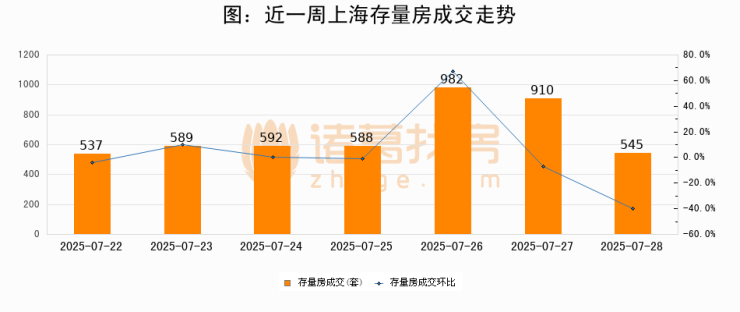 从存量房来看,2025年07月28日上海存量房单日成交545套,比昨日减少365套,环比下降40.1%。从近一周存量房成交来看,上海存量房日均成交套数为677套,07月28日单日成交545套,低于近一周平均水平19.5%。