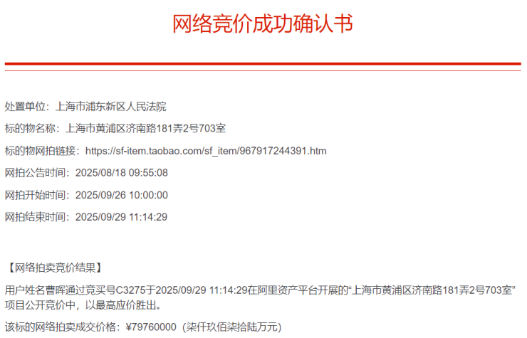 2025年9月29日,曹晖通过司法拍卖公开竞得上海市黄浦区济南路181弄(翠湖五期)2号703室住宅,成交价7976万,折合建筑面积单价超过23.2万/㎡。