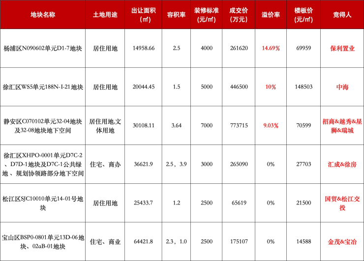 本次土拍呈现“核心热、外围稳”的明显特征,徐汇滨江、静安苏河湾、杨浦定海三幅地块溢价成交,其中徐汇滨江地块以14.85万元/㎡的楼板价刷新全国住宅单价地王纪录;松江新城、徐汇华泾、宝山杨行三幅地块则以底价成交。