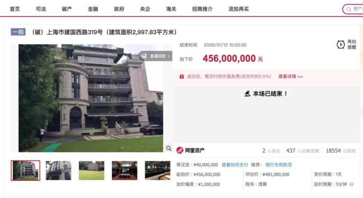 1月12日,上海衡复风貌区一幢独栋办公花园洋房法拍房以4.56亿元底价成交,建筑面积2997.83㎡,折合单价达15.21万元/㎡。