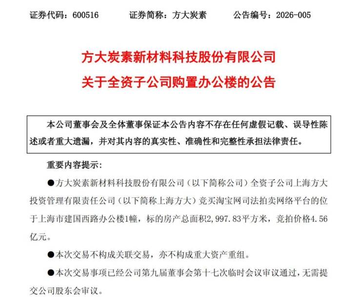 竞得方为上海方大投资管理有限责任公司,属于方大炭素新材料科技股份有限公司旗下全资子公司。成交第二天,方大炭素发布公告,称本次交易不构成关联交易,亦不构成重大资产重组,是为了满足上海方大业务发展的需要。