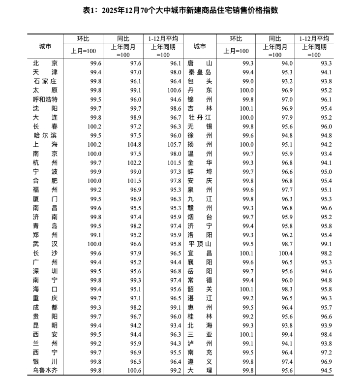 1月19日,国家统计局发布2025年12月份70个大中城市商品住宅销售价格变动情况。国家统计局城市司首席统计师王中华解读认为,2025年12月份,70个大中城市商品住宅销售价格环比总体下降、同比降幅扩大。