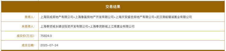 7月24日,2025年上海市第六批次土拍正式开拍,奉贤新城04单元14—04地块共有两组房企参拍,分别为奉贤新城&奉发、国贸&象屿联合体。