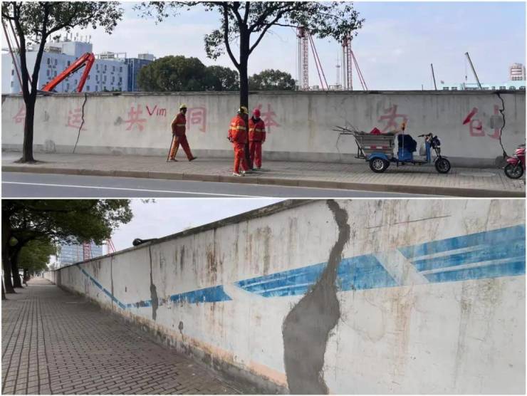 绕场一周看到,工地南侧围墙存在多处裂痕,虽经水泥修补,仍可见痕迹。值得注意的是,工地四周并未张贴任何许可证和施工铭牌,初步印证了网友所指的“无证施工”嫌疑。