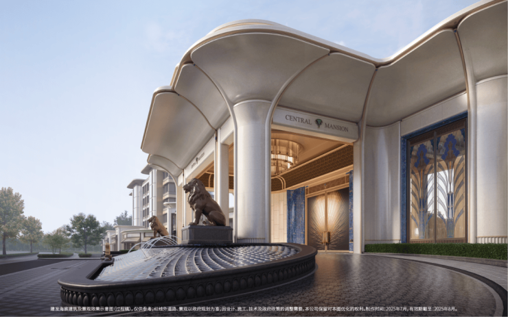建发·海宸的「玉兰门庭」摩登飘逸,环抱式落客前场,灵感源自意大利许愿池,大师定制非遗掐丝珐琅门钹,流转温润光华,敬呈归家尊崇礼序,自此启幕生活的华贵序章。
