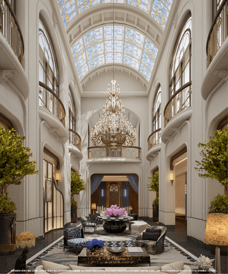 萃取东方色谱精粹,建发·海宸甄选丝箔流金、东方雅铜、青釉奢蓝,以当代笔触晕染立面,令传统色彩在空间生长为永恒的诗意。入户门头形取和平饭店经典拱门,配以碧绿色天然石材门套、彩玻花窗,重现百年外滩门廊的尊崇仪式。