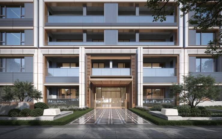 项目采用公建化立面,以大面积铝板、玻璃幕墙与石材的组合。这样不仅极低的维护成本还提升了对抗时间侵蚀的耐久性,成为资产长期保值的“硬通货”。