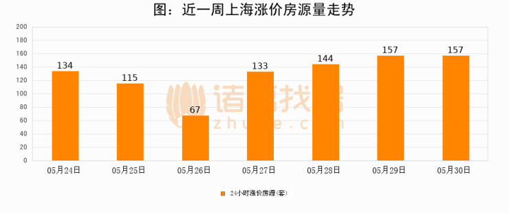 根据诸葛找房数据显示,上海24小时涨价房源量为157套,较05月29日持平。