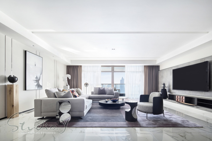 客厅的白色地面明净简洁,纹路自然蜿蜒舒展,轻重相合,浓淡有致,是眼睛的一次洗礼。