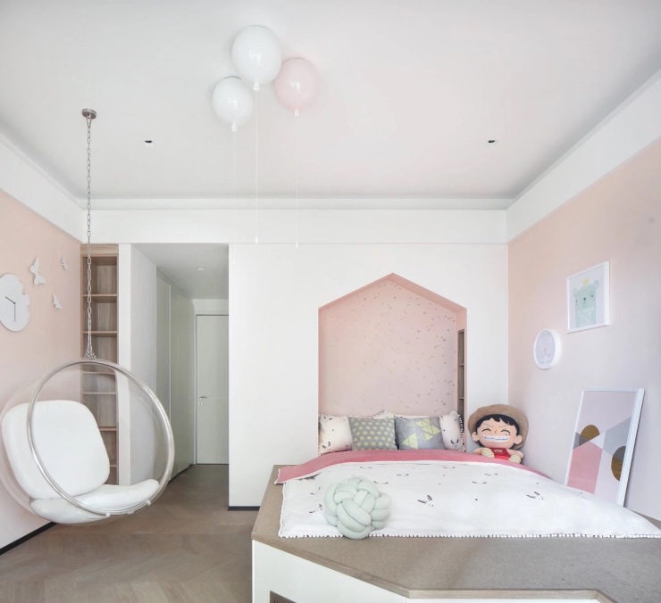 部分饰品由小主人亲自选择,轻盈透明的泡泡椅,粉色的时空之门,“飘”在天花板上的气球灯,纯白色挂钟飞出几只翩跹的蝴蝶,满足了小女孩自由快乐的天性,仿佛一个烂漫梦幻的梦正在起飞。
