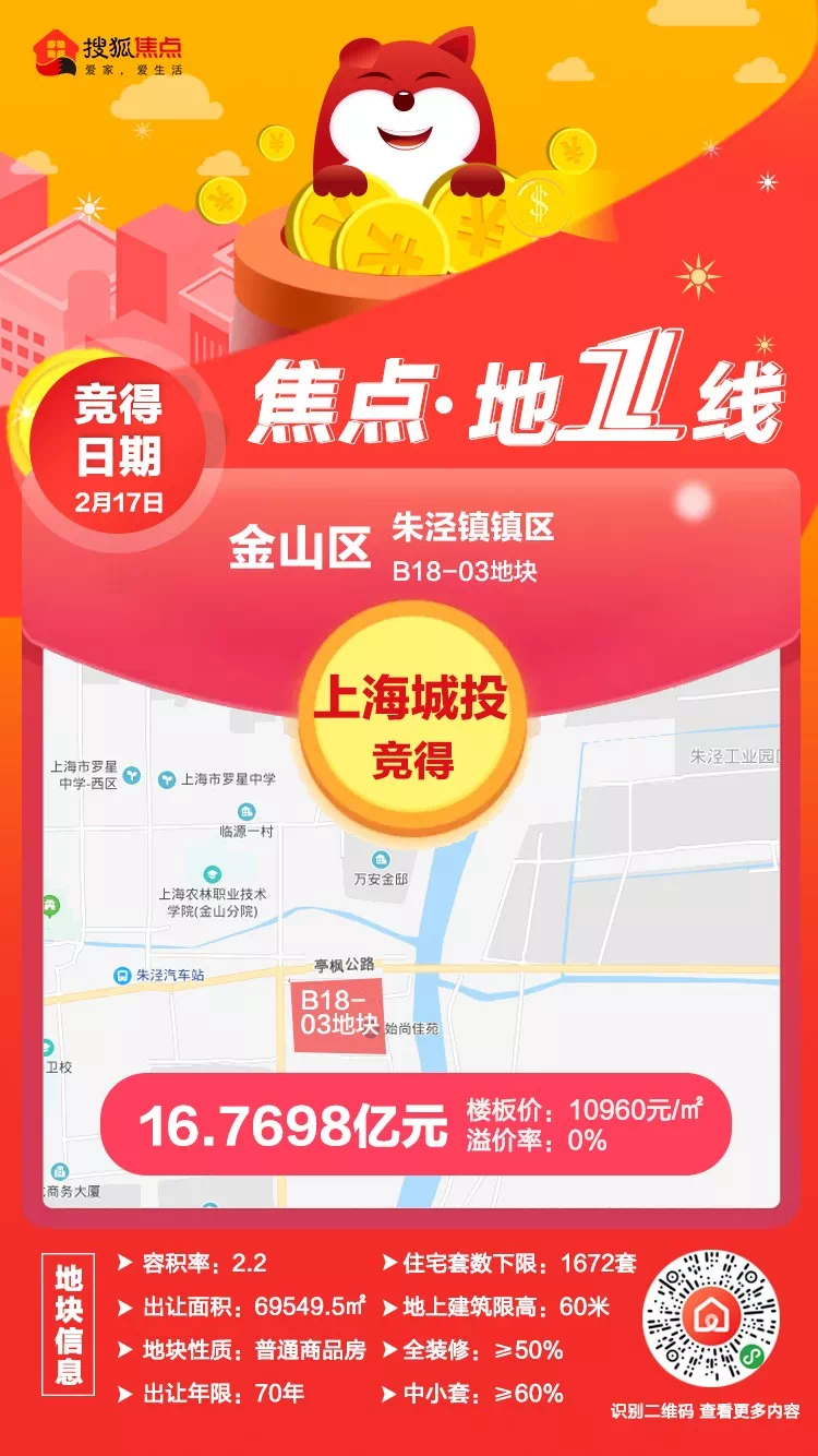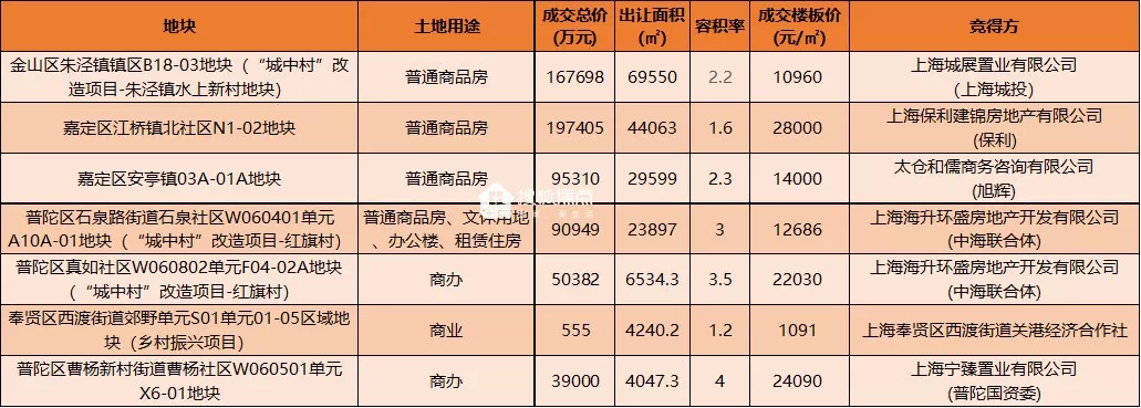 金山区朱泾镇镇区B18-03地块(“城中村”改造项目-朱泾镇水上新村地块)由上海城展置业有限公司以底价16.7698亿元竞得,成交楼板价10960元/㎡。