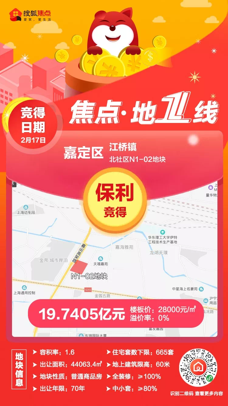 嘉定区江桥镇北社区N1-02地块由上海保利建锦房地产有限公司(保利)竞得,成交总价19.7405亿元,成交楼板价28000元/㎡。