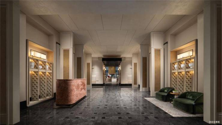 电梯前厅独享,门头采用石库门元素,条石做框,叠级细节层次丰富。电梯按键处的弧度,灵感来自旗袍领口。宠物按钮的人性化设计,更是把日常痛点考虑到了极致。