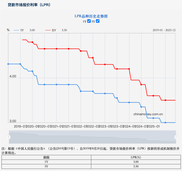 中国人民银行授权全国银行间同业拆借中心公布,2025年12月22日贷款市场报价利率(LPR)为:1年期LPR为3.0%,5年期以上LPR为3.5%;两者均维持不变。以上LPR在下一次发布LPR之前有效。
