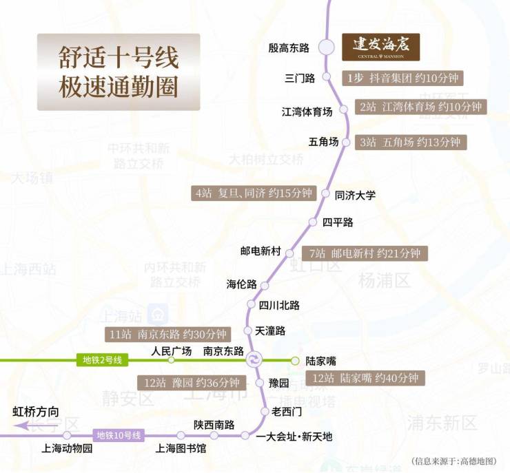 上海轨交大动脉——地铁10号线,与建发海宸直线距离仅约500米,3站五角场,11站南京东路,直达豫园、新天地、虹桥枢纽,便捷换乘2号线,1站畅达陆家嘴