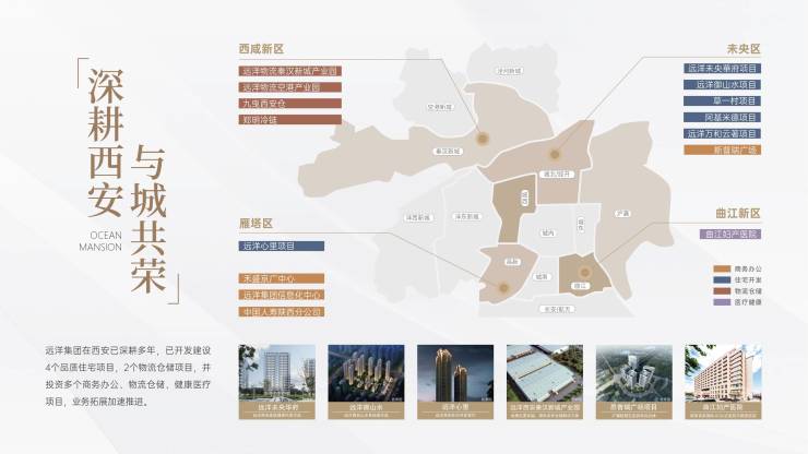 远洋集团已深耕西安多年,已开发建设4个品质住宅项目,2个物流仓储项目,并投资多个商业办公、物流仓储、健康医疗、业务拓展加速推进。