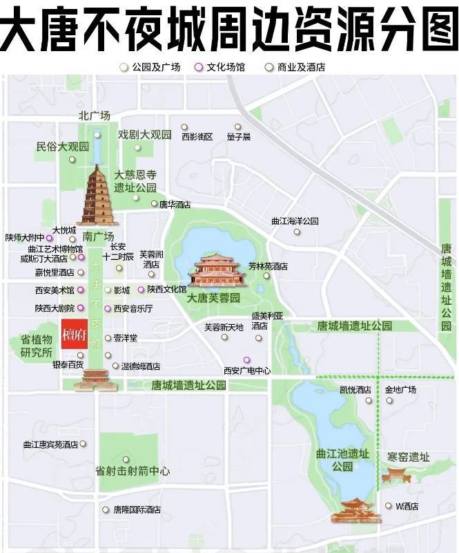 - 文旅:大雁塔、陕西大剧院、曲江池遗址公园步行可达;