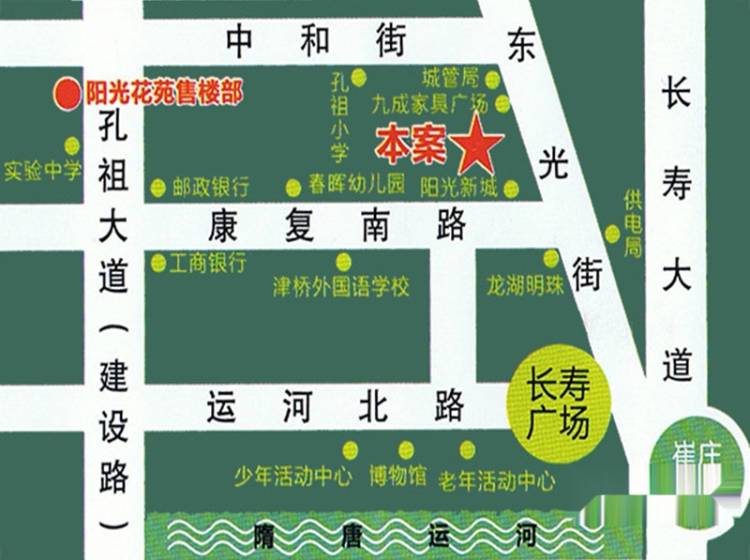 阳光花苑位于东光街南段九龙家具广场西,总建筑面积:45000 平方米,绿化率:40 %。