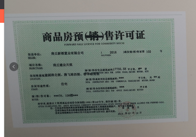 - (2018)商房预(销)售证第102 详情发证时间 2018-07-19绑定楼栋7#,10#楼证件照片