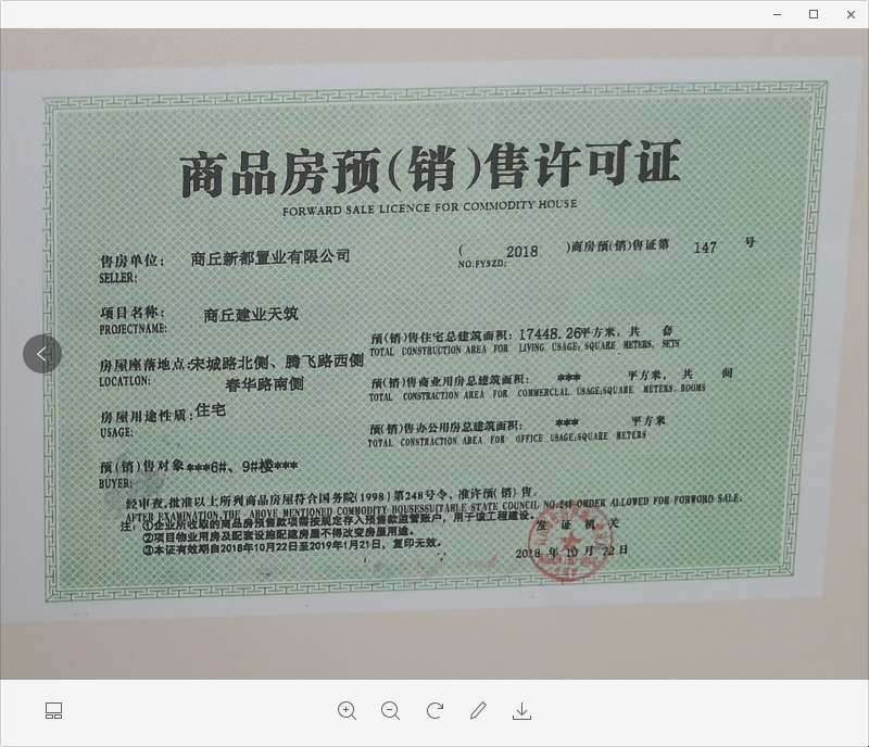 - (2018)商房预(销)售证第147号 详情发证时间 2018-10-22绑定楼栋6#,9#楼证件照片