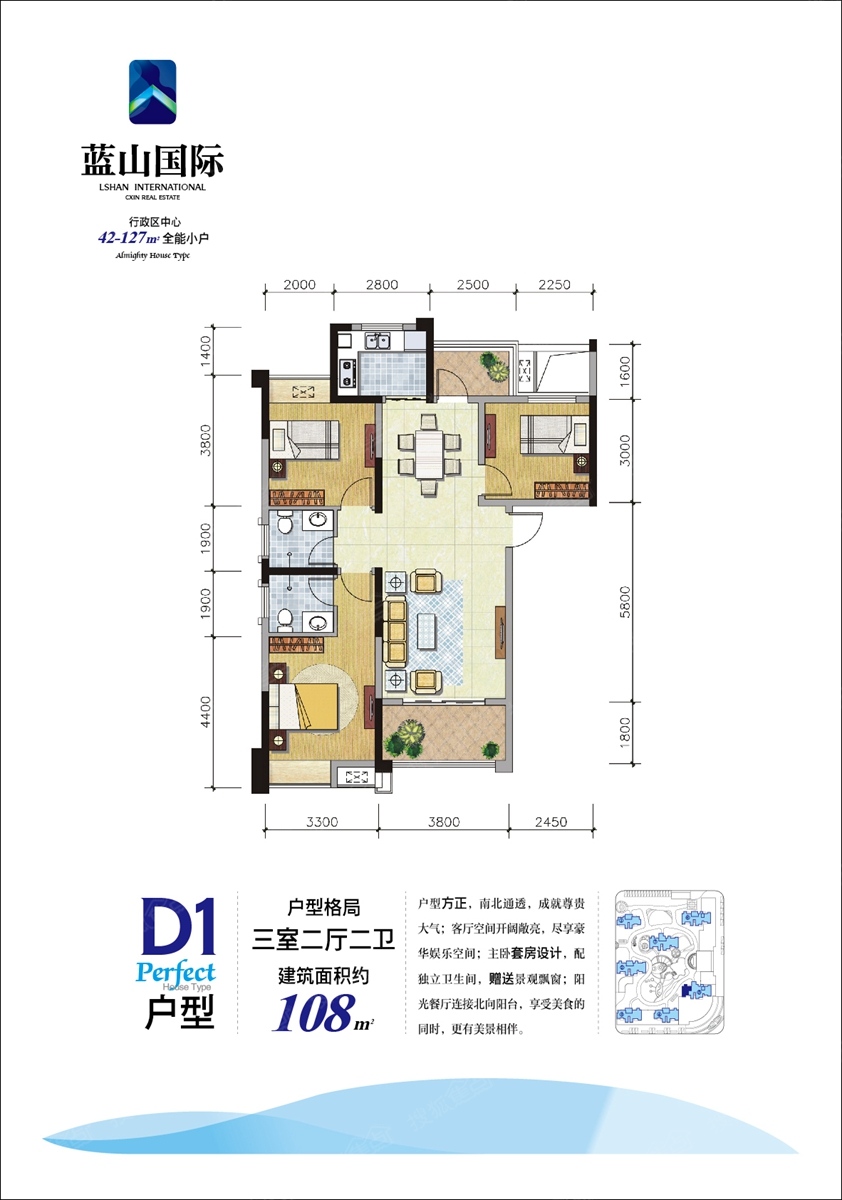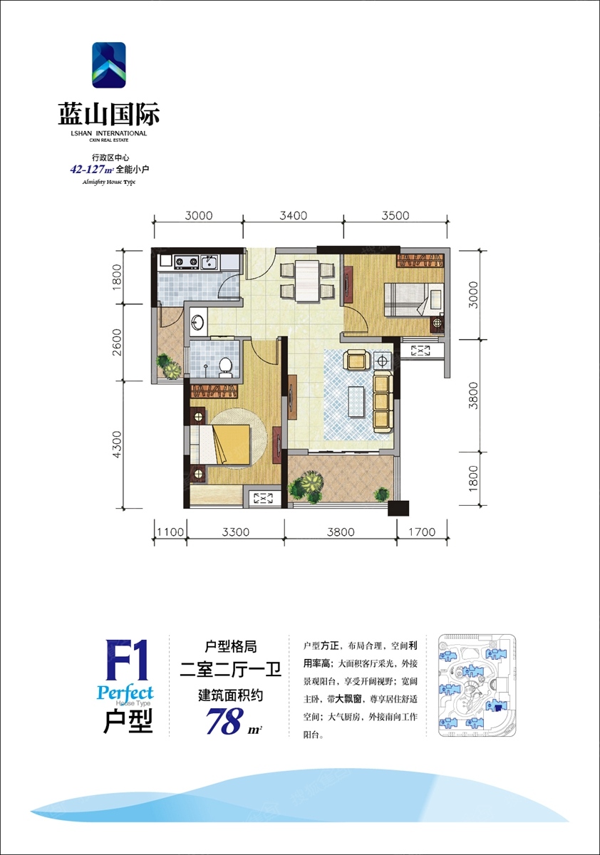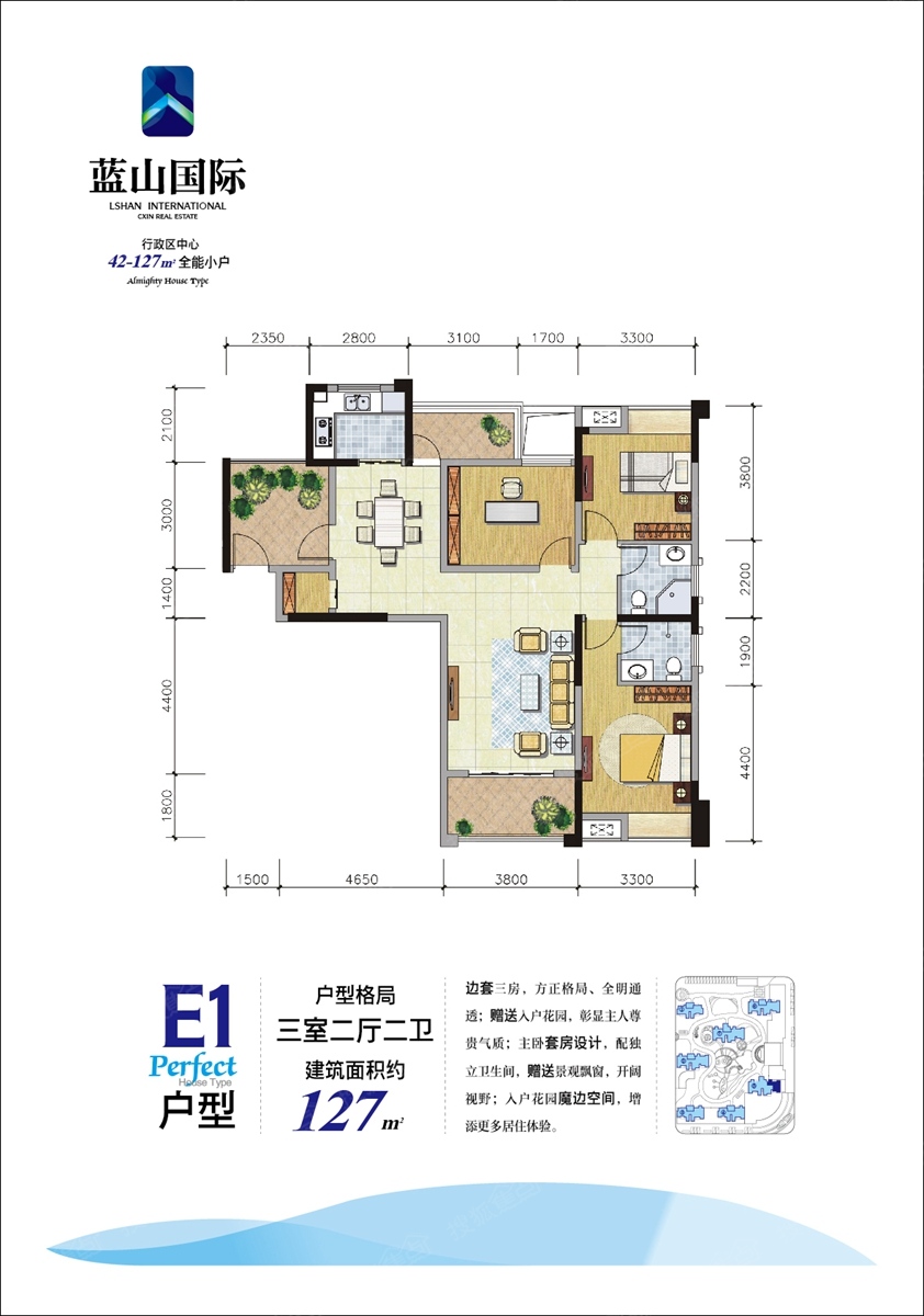 蓝山国际规划共7栋高层,两梯四户,户型面积为47㎡-127㎡全能小户,其中7#为楼王共25层,剩余6栋均为18层。预计共有495套房源,车位461个。