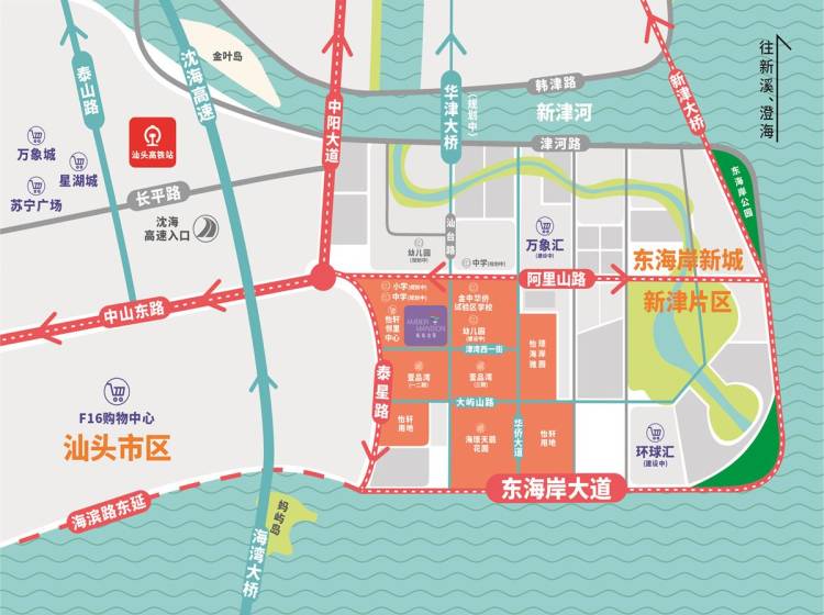 周边公共交通:沈海高速中阳大道出入口改造项目预计最快将在8月底完成;新津河大桥正加紧施工桥面附属工程;深汕高速泰山路出口、海湾大桥、金阳大桥、汕头高铁站