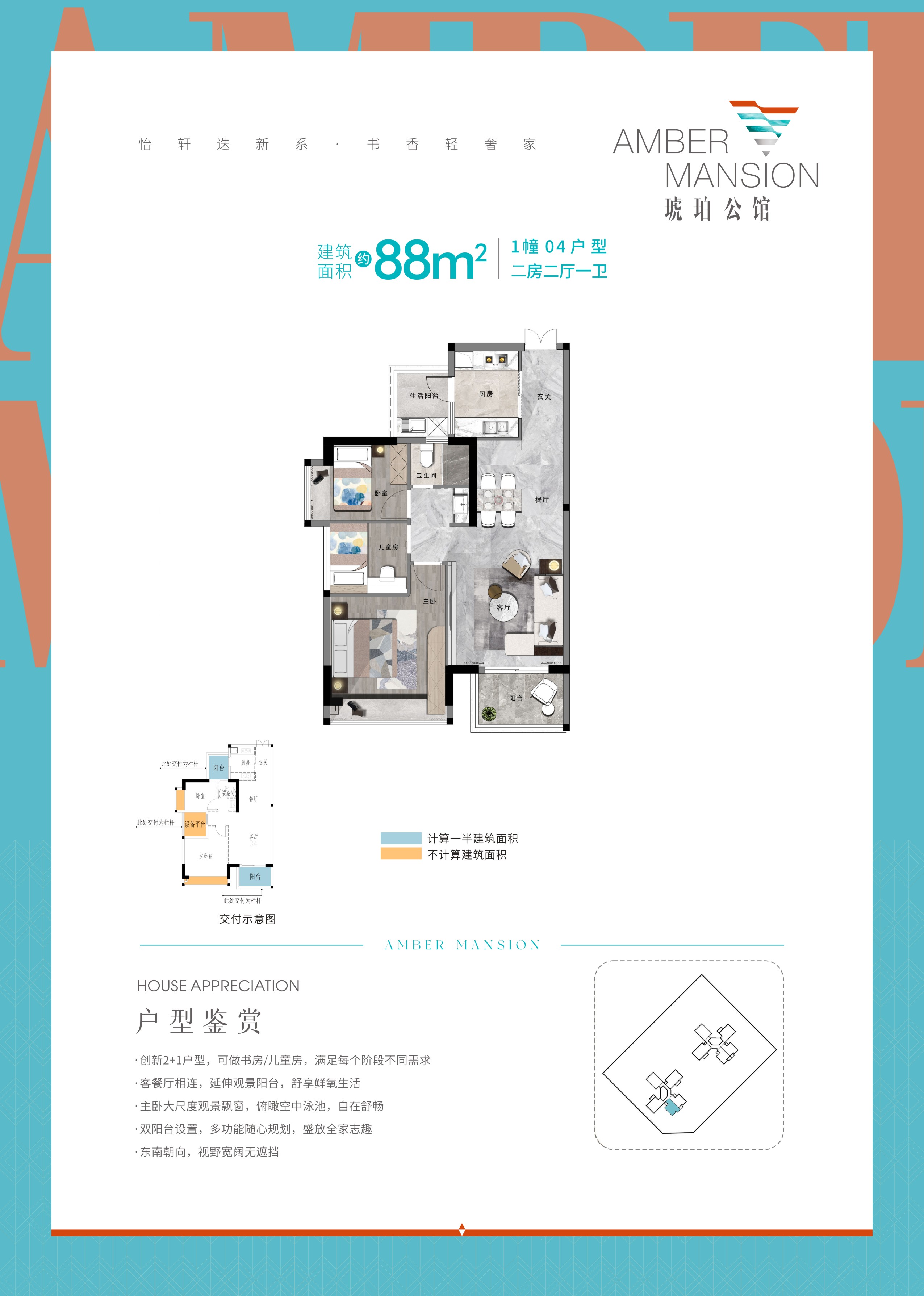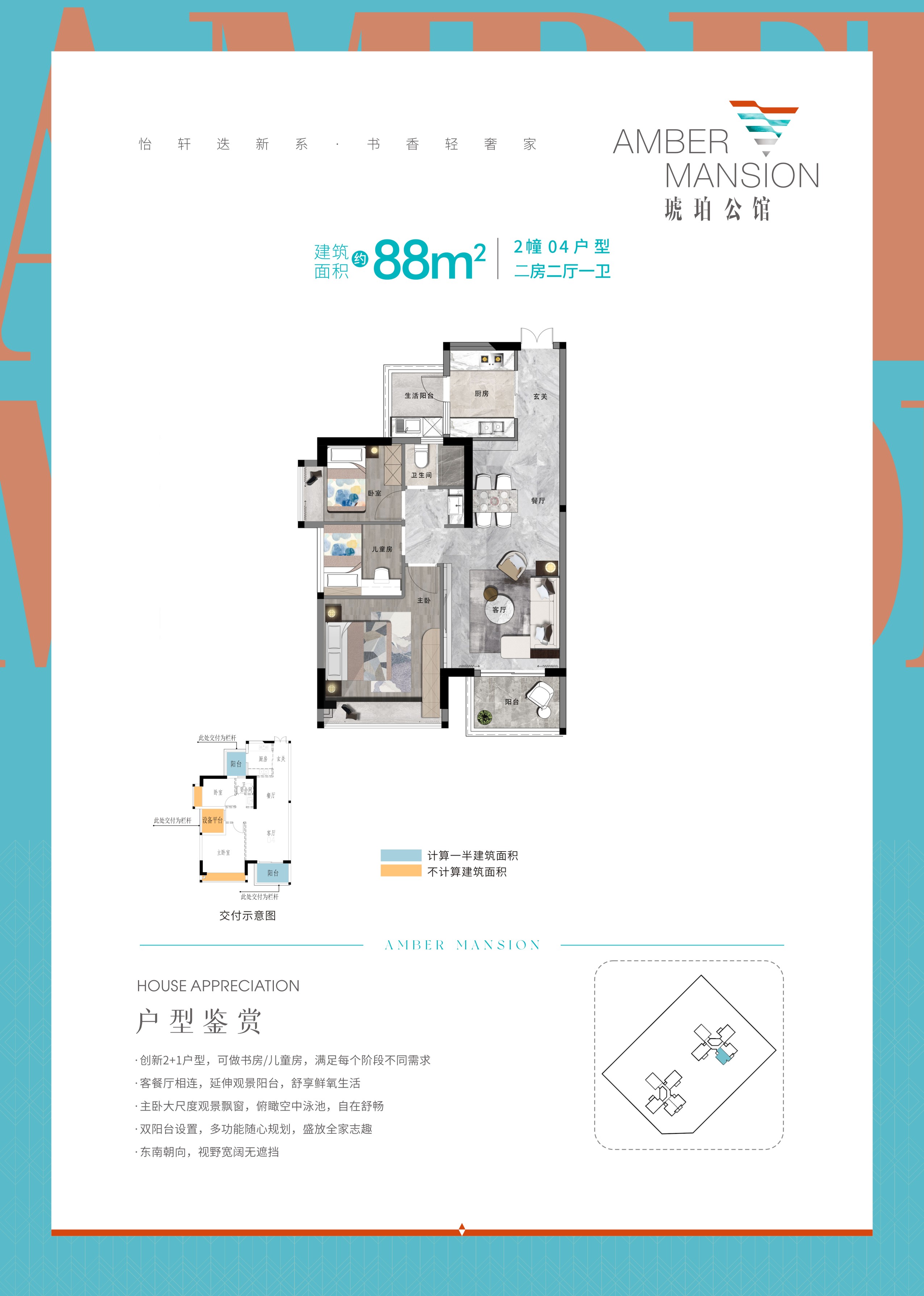 2室2厅1卫-建筑面积约88m²2幢04户型