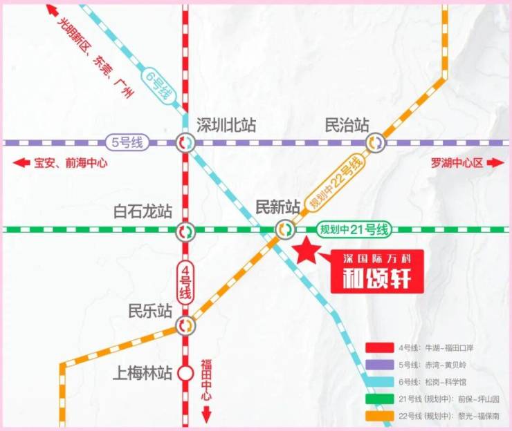 地铁-地铁线路密集: 1站深圳北,2站福田。4/5/6/21(规划中)/22(在建中)号线,5条地铁环绕;项目距离4号线白石龙站直线距离约600m,便捷通达;
