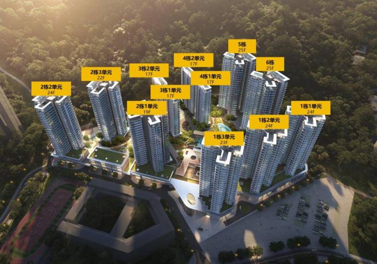 项目整体为南北朝向,楼栋高低错落式分布,呈围合式布局,顺应山体的走势,而山体走势与楼体朝向形成高差,可以保障每个楼栋充足的日照时长以及良好通风采光条件。