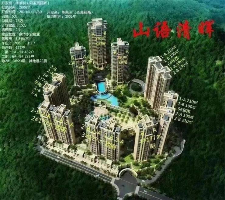 山语清晖位于香蜜湖半山区,在福龙路西侧、北环大道北侧。拥有5万平米占地,总建面24.5万平米,计容建面约15万平米。山语清晖项目分两期开发,规划有9栋高层,主要有170-370平米奢华景观大宅及顶层复式组成。三面环山,社区内近5000平方米三层集中式会所活动空间及2000平方米的商业,片区内有市政规划的学校和幼儿园等基础配套。