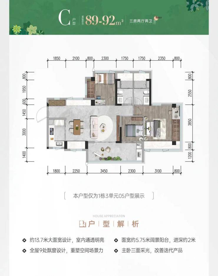 前海会展首发建面约78-117㎡三四房新规作品,户型拓展后实际使用率最高可达105%;主、次卧270°转角双飘窗(建面约117m次卧除外);建面约9-13㎡新规宽景阳台重构居住想象