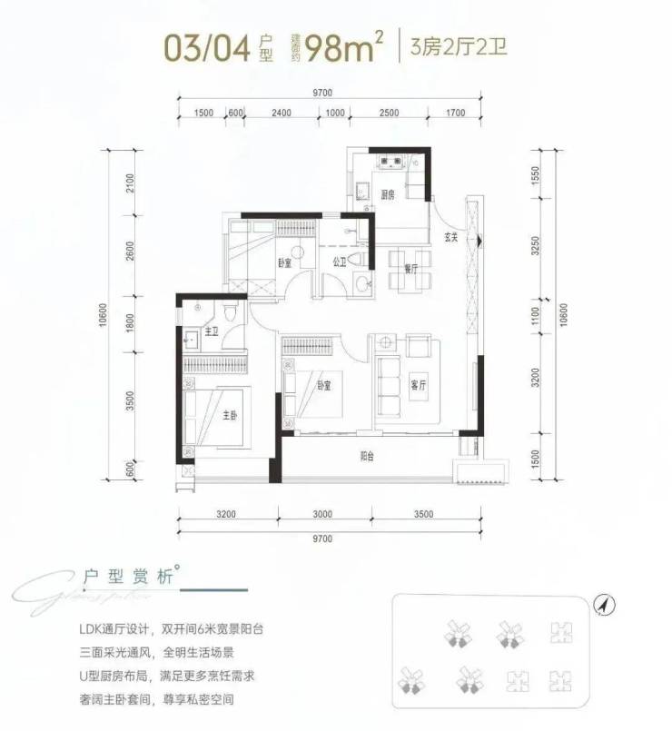 建面约98㎡是传统竖厅动静分区格局,客厅进深7.55米(不含阳台),开间3.5米,配有6.5米宽景阳台,主卧13.18㎡(不含主卫和飘窗),客厅空间变化不大,但厨房和卧室空间要好很多,居住的舒适性会比较好。