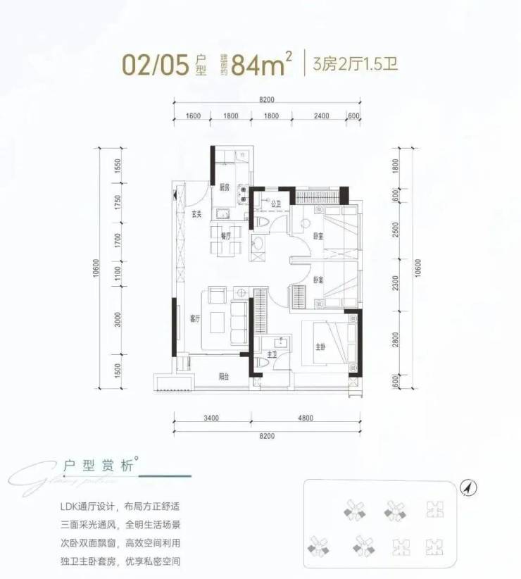 推出建面约84㎡三房两厅两卫,约98㎡三房两厅两卫,约114㎡四房两厅两卫,约128㎡四房两厅两卫,共计4个面积段产品。