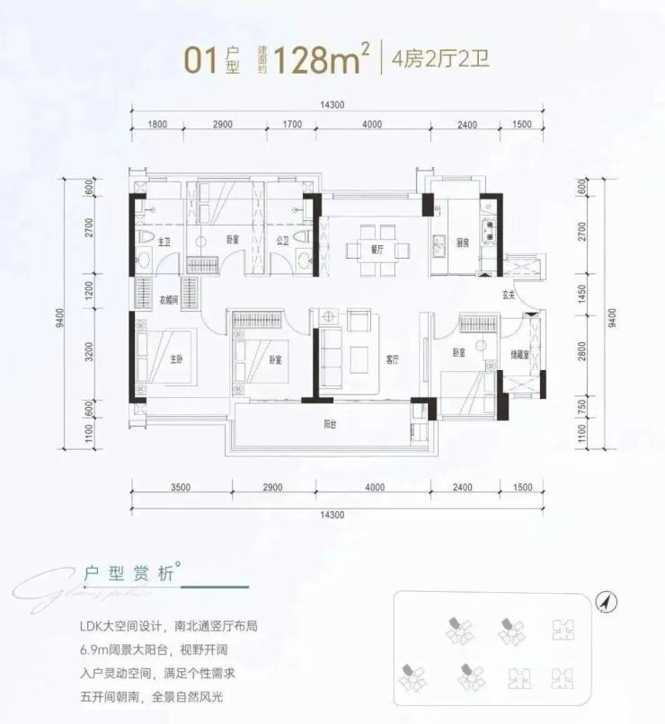 建面约128㎡属于南北通透竖厅格局,客厅进深7.1米(不含阳台),开间4米,配有6.96米宽景阳台,主卧套间设计,配有衣帽间和三段式卫生间。这个户型除通透性比传统横厅更优异外,静区部分的静溢性也会比较好,居住舒适性更佳,受众也是老少皆宜。