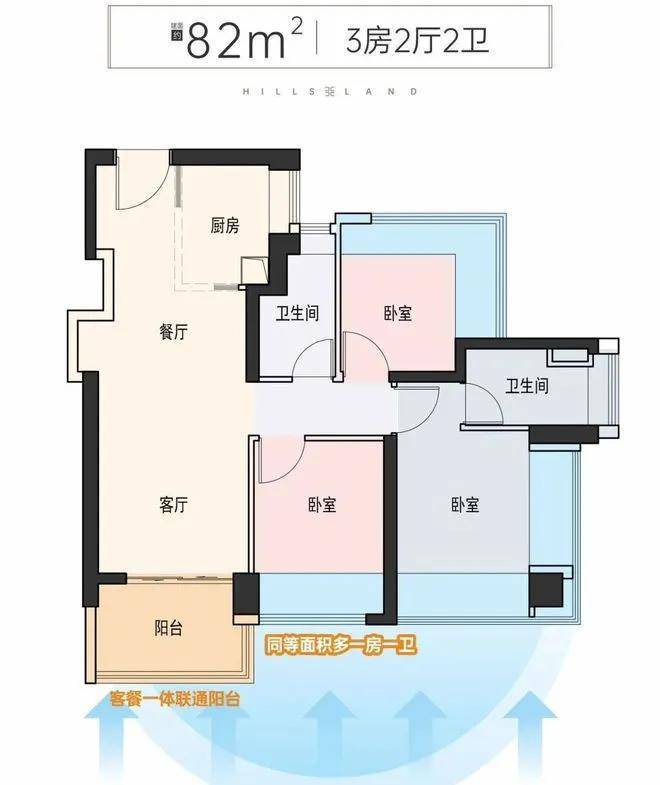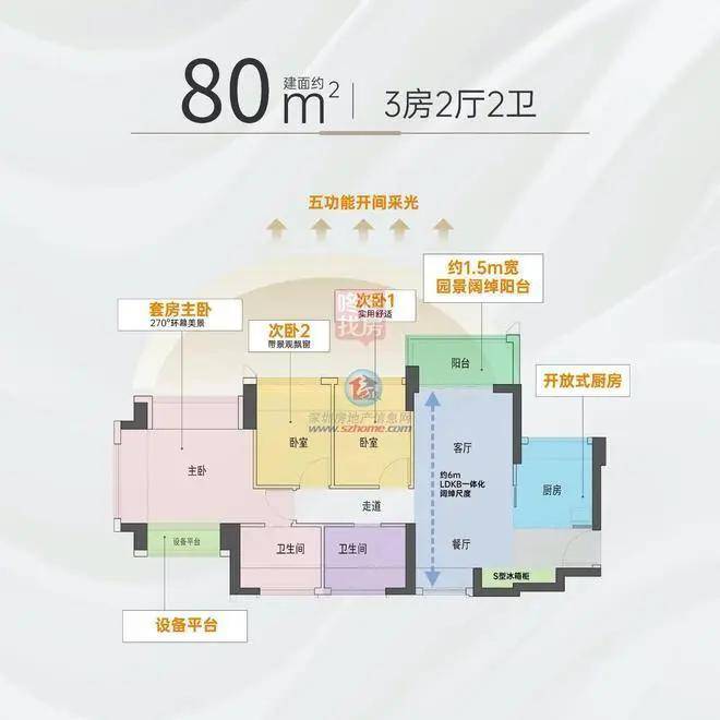 80㎡是本批次产品中唯一设计为南北对流格局,而且是整体横向采光,位于1栋,仅有2条腿,朝向社区内部园林相对静谧。