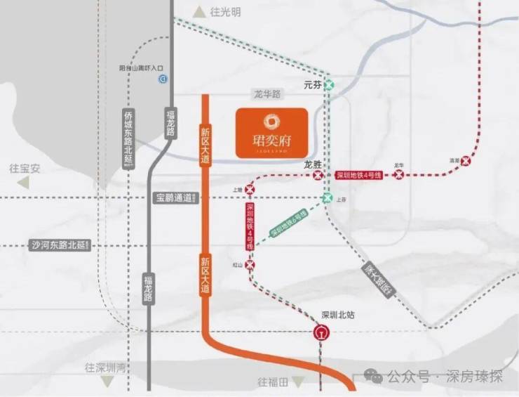 卓越珺奕府,位于位于龙华区大浪街道龙坂大道与锦华南路交汇处,地处龙华“数字龙华、都市核心”战略核心发展轴,紧邻红山-上塘高端居住区。项目距离地铁4号线龙胜站仅500米,两站直达深圳北站枢纽,未来深大城际线(在建)通车后,3站可至宝安机场,跨区通勤高效。周边主干道布龙路、福龙路及规划中的侨城东路北延线,可快速连接福田、南山,形成“一线通勤”网络。