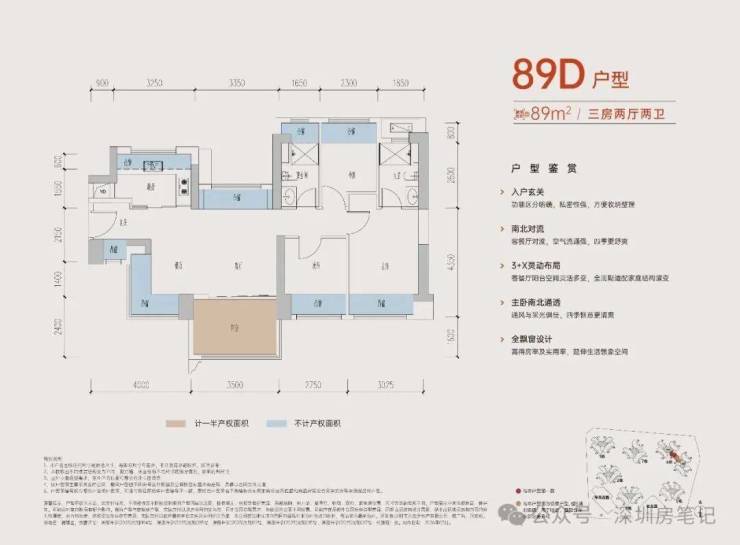 89㎡3房:268-302万,单价2.98-3.39万/㎡