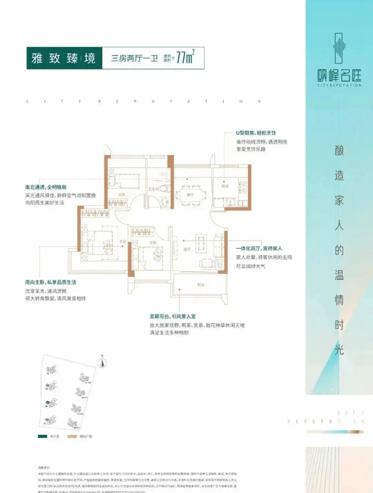 方正户型格局,合理的动线规划,让一家人的生活,亲密而又保持恰当的距离;客厅与阳台、餐厅一脉相连,空间更敞阔,家人欢聚畅饮之时,一起享受追剧的欣喜;U型厨房,流畅的操作动线,于启开启一场酝酿美味的舌尖之旅。其中建面约77㎡户型,南北通透格局,高得房率打造三房奢享,即使家中两个孩子亦能阔享。
