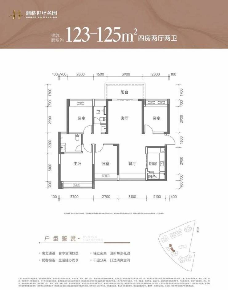 125㎡的4房2厅2卫:竖厅南北通透格局,客厅3.9米开间,LDKB一体化设计,4个卧室分别做到了3.7米/2.8米/2.8米/2.7米的宽度,L型厨房带1个小生活阳台,公卫三段式分离,阳台主朝东北或东南向。