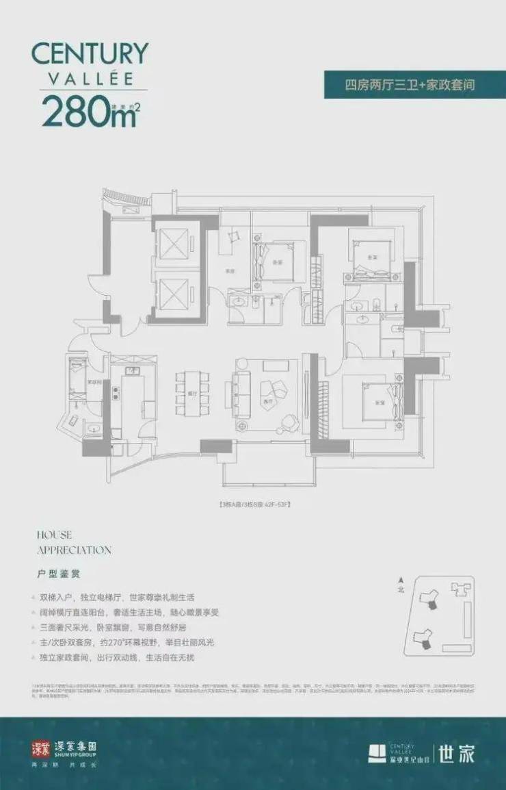 建面约280㎡四房两厅三卫+家政套间,是双套房的配置,也拥有270°的环幕视野,且景观更有层次。