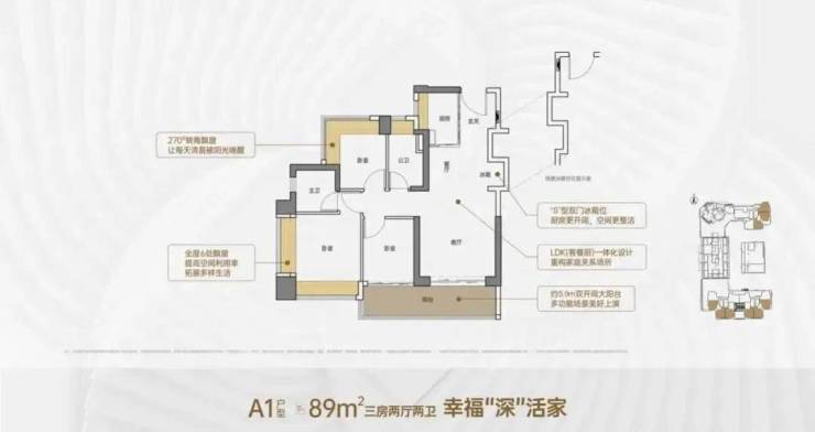 竖厅格局,客厅3.5米开间,LDKB一体化,S墙设计预留冰箱卡槽位,客厅连接次卧出5.9米长的大阳台,主卧双面飘窗,次卧270°转角飘窗,全屋6面飘窗,U型厨房,卫生间干湿分离。