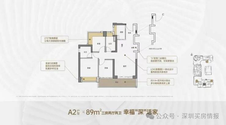 89㎡的3房2厅2卫,A2户型,设计的是竖厅格局,客厅3.5米开间,LDKB一体化,S墙设计预留冰箱卡槽位,客厅连接次卧出5.9米长的大阳台,次卧270度转角飘窗,U型厨房,卫生间干湿分离,阳台有朝西向、东向、南向。