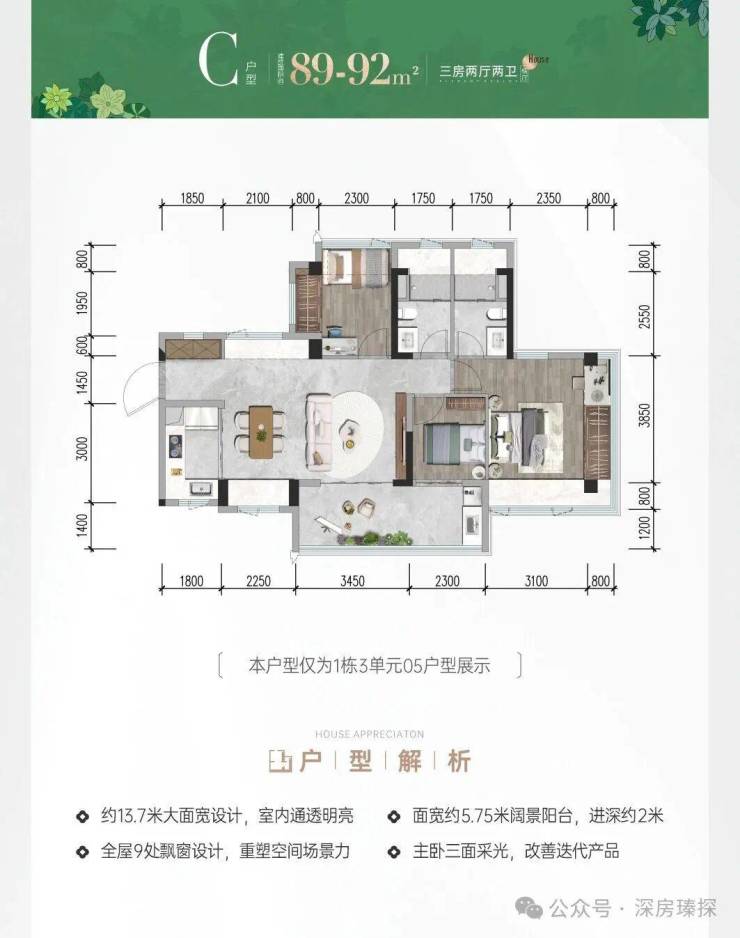89-92㎡的3房2厅2卫,C户型,设计的是横厅南北通透格局,进门入户玄关,客餐厅5.7米开间,LDKB一体化设计,主卧套房双飘窗,分别做到了主卧18.5㎡/次卧7.7㎡/次卧6.9㎡(包含墙体飘窗),客厅连接次卧出11.5㎡的巨幕大阳台,U型厨房,科学双明卫,得房率约78.9%(不含赠送),阳台主朝东南向。套内面积71.4㎡+赠送面积22.8㎡=实得94.2㎡,加上赠送后得房率约105.22%。