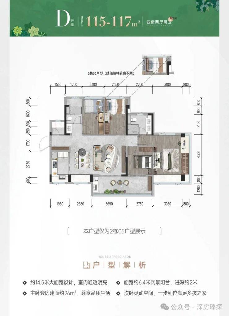 115-117㎡的4房2厅2卫,设计的是横厅南北通透格局,进门入户玄关,客餐厅6米开间,LDKB一体化设计,主卧套房双飘窗,分别做到了主卧20.83㎡/次卧8.74㎡/次卧8.93㎡/次卧8.25㎡(包含墙体飘窗),客厅连接次卧出12.8㎡的巨幕大阳台,U型厨房,科学双明卫,得房率约78.9%(不含赠送),阳台主朝东南向。套内面积92.08㎡+赠送面积21.55㎡=实得113.63㎡,加上赠送后得房率约98.44%。