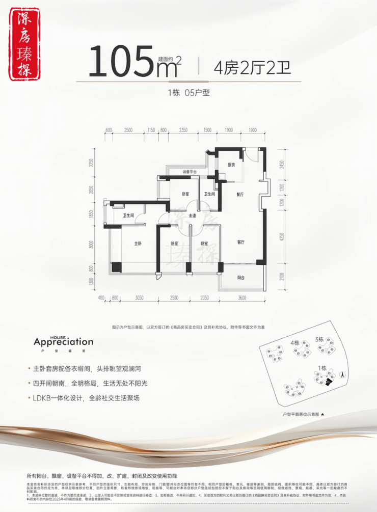 105㎡的4房2厅2卫,设计的是经典竖厅格局,进门入户玄关,客厅3.6米开间,LDKB一体化设计,动静分区,四开间朝南,S墙设计预留冰箱卡槽位,分别做到了主卧17.59㎡/次卧9.5㎡/次卧8.93㎡/次卧7.75㎡(包含墙体飘窗),U型厨房,卫生间干湿分离,公卫还带1个3.12㎡的设备平台,得房率约:100%(包含赠送),东南朝向看观澜河景观。