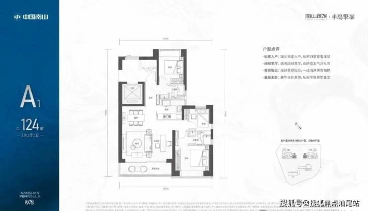 另一款124平方米的户型同样采用电梯入户和独立公共区域的设计,竖厅格局与LDKB一体化相结合,确保了动静分区。此设计还包括主卧套间和一个多功能房间,可作为书房使用。U型厨房和公卫三段式分离提升了居住的舒适性和便利性。得房率同样为72.07%,朝向为西南。